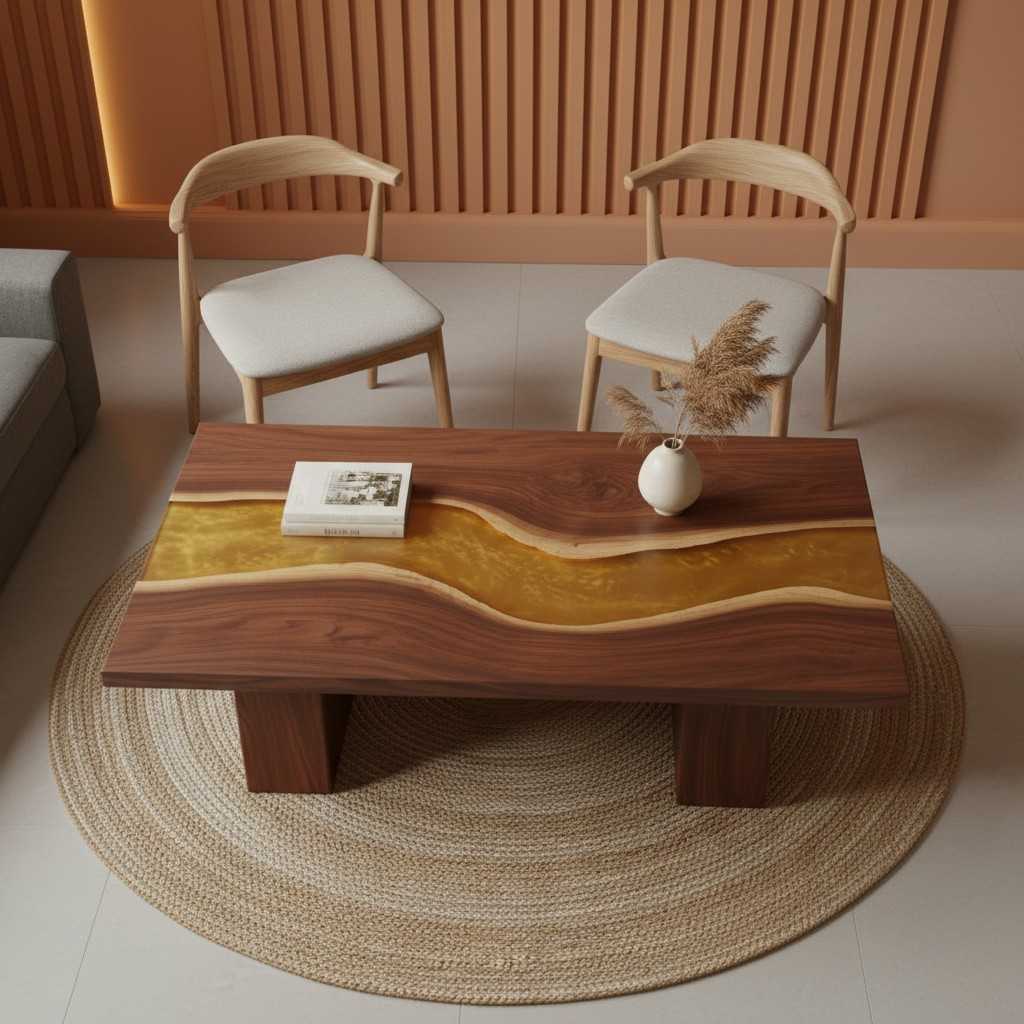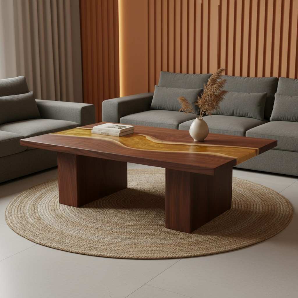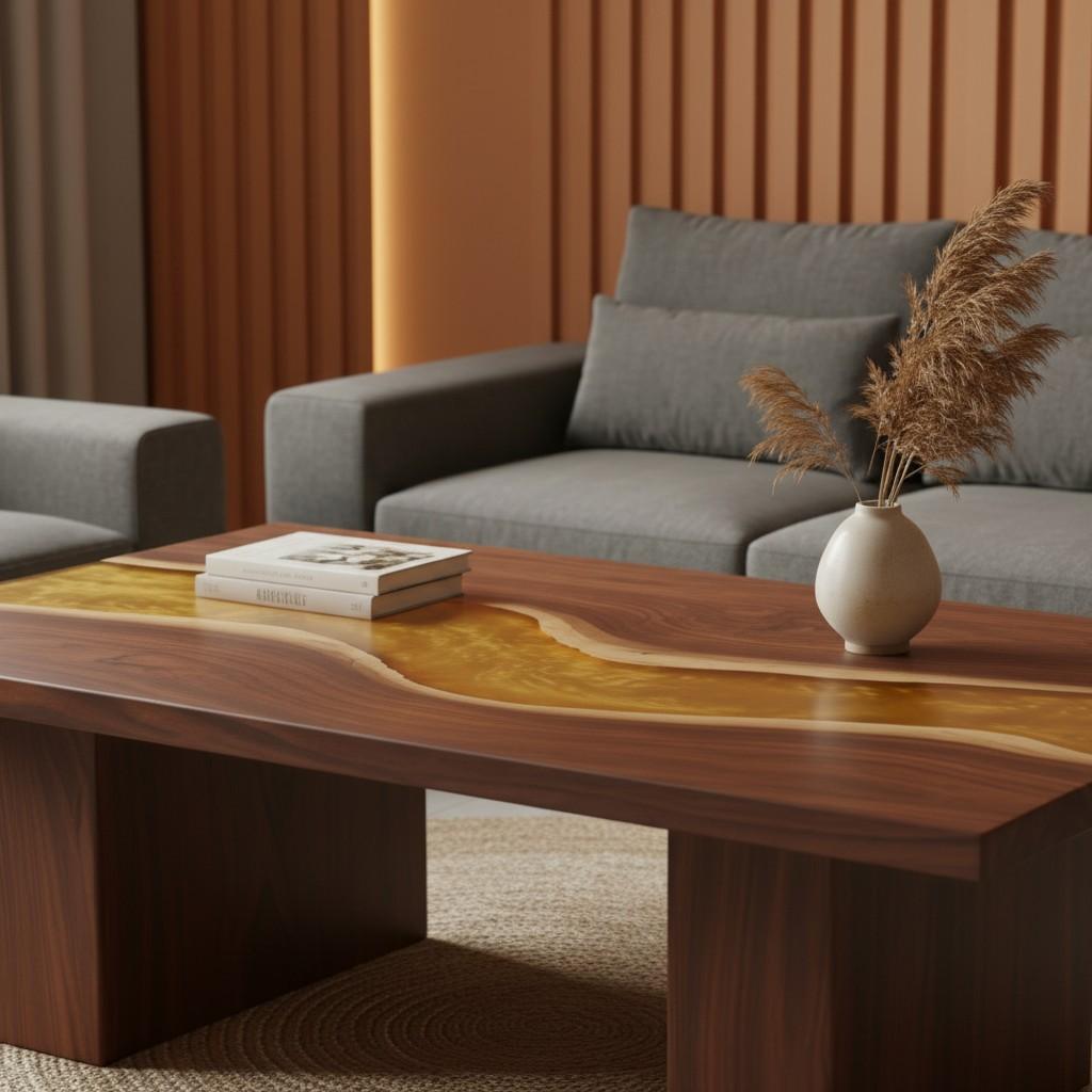 The rich walnut tones bring warmth, while the glossy resin adds a subtle contrast that catches the light beautifully. Its sturdy block legs provide a grounded, modern feel, balancing rustic charm with contemporary design.