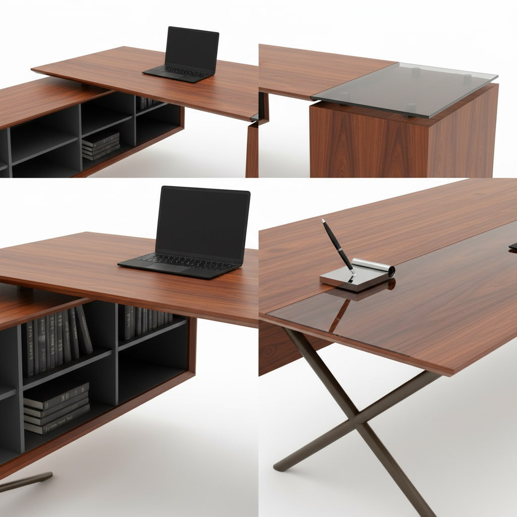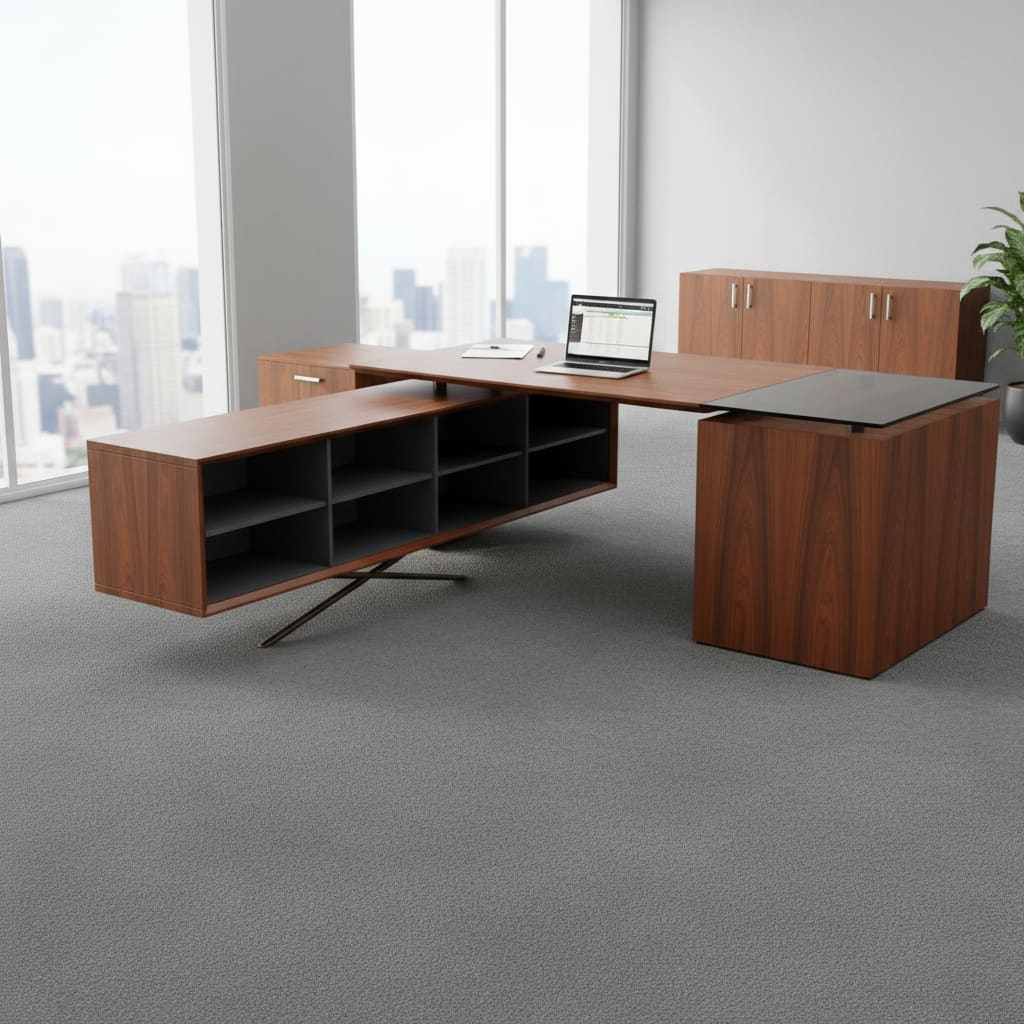 Upgrade your office with this high-end L-shaped executive table. This desk features a dual-surface design: a warm wood veneer main desk and a sophisticated glass-top return. The integrated storage unit includes 6 open compartments for books and files, supported by a heavy-duty powder-coated steel base. Designed for durability and style, this desk accommodates dual-monitor setups and provides ample legroom for all-day comfort.
