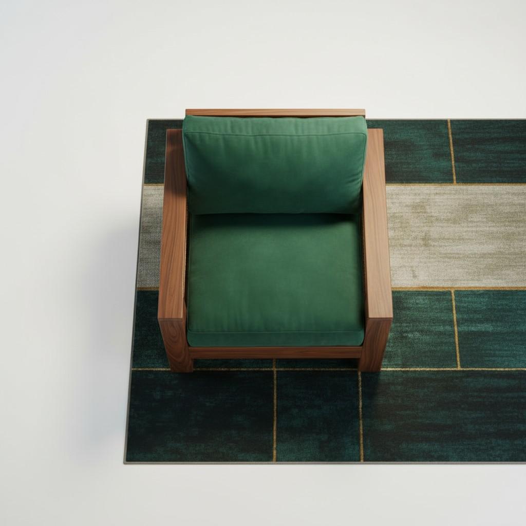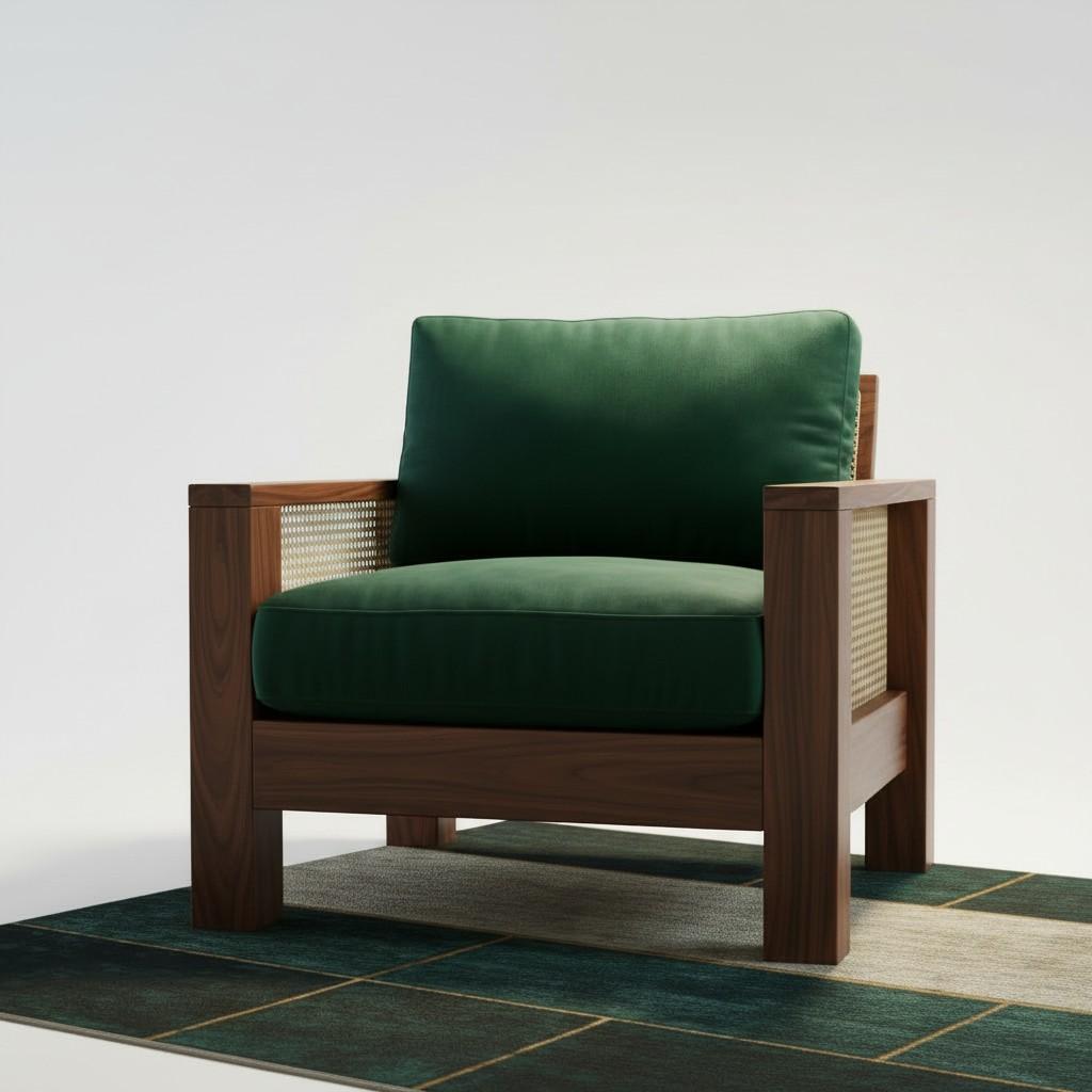 Add a touch of character to your space with this beautifully crafted wooden arm chair. Designed with a solid wood frame and detailed cane panel sides, it blends natural textures with a refined modern look. The deep green cushion brings a rich contrast, offering both comfort and visual appeal. With its wide seat and supportive structure, this chair is perfect for relaxing corners, reading spaces, or stylish living areas. The clean lines keep it minimal, while the materials add warmth and depth. Built to last and easy to style, it fits seamlessly into both contemporary and classic interiors, making it a versatile addition to any home.