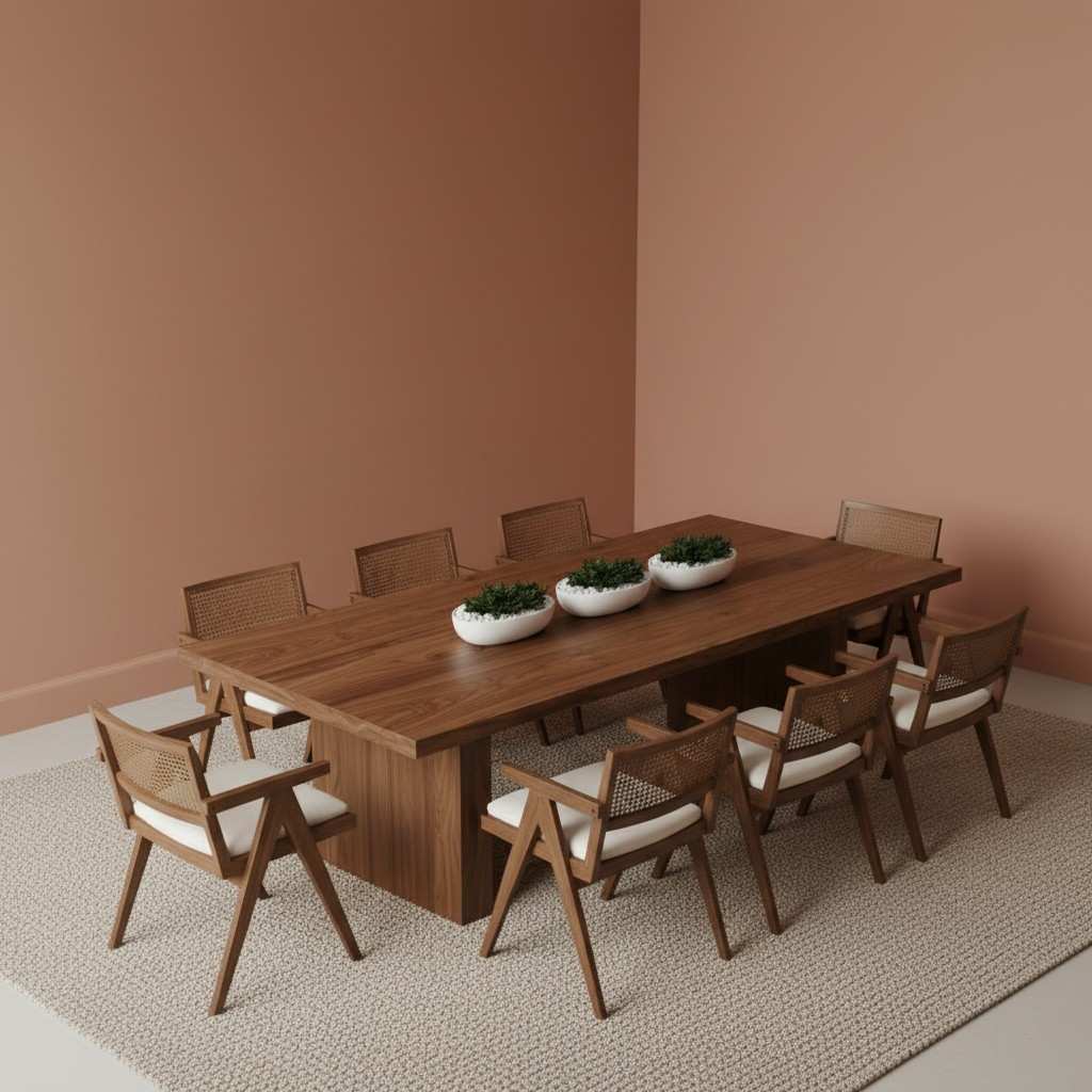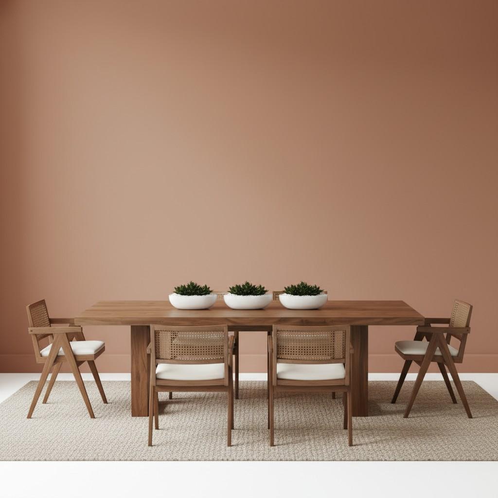 Crafted for homes that value comfort and character, this dining set brings together solid wood strength and the light charm of cane detailing. The spacious tabletop offers plenty of room for gatherings, while the warm teak tone adds a cozy, lived-in feel to your space.