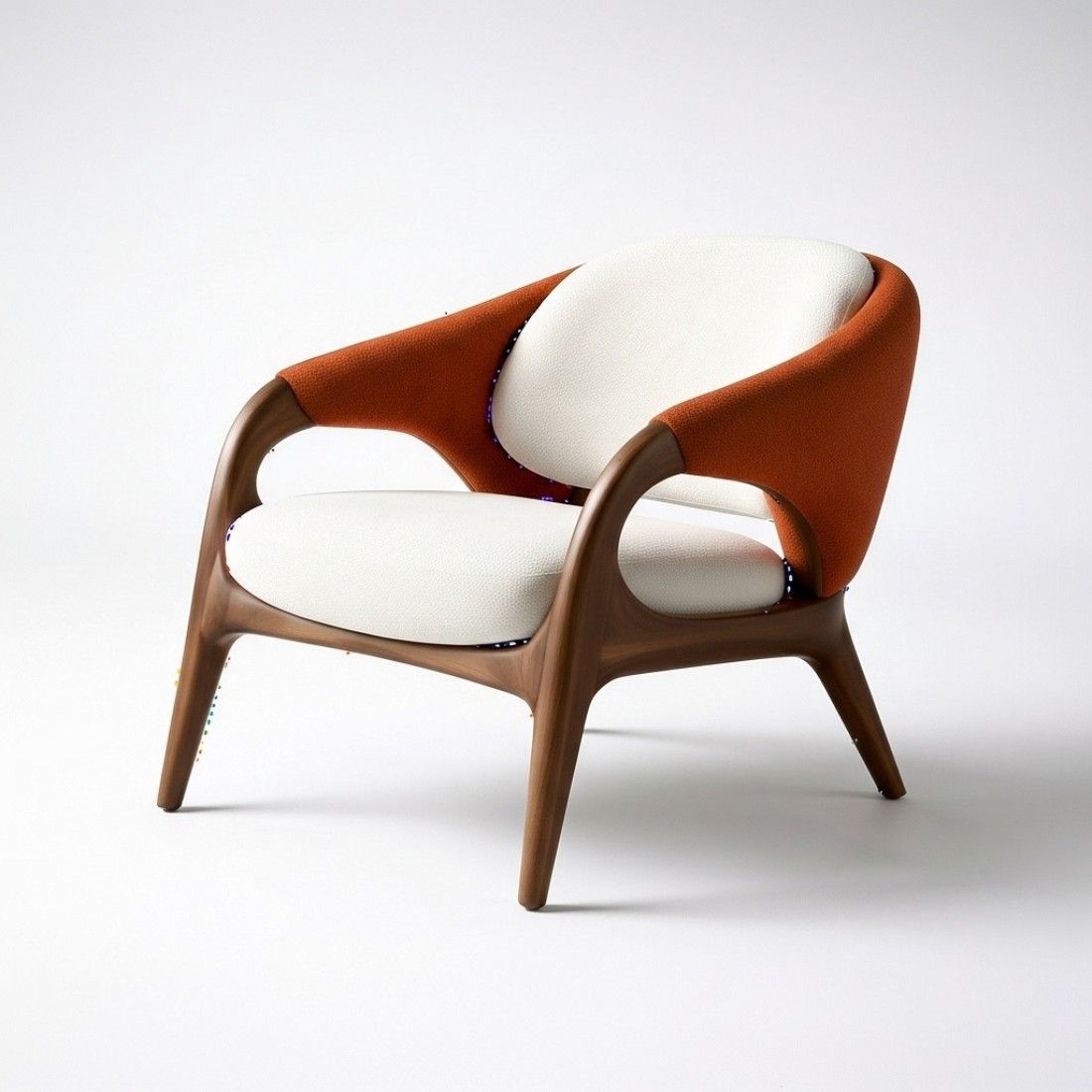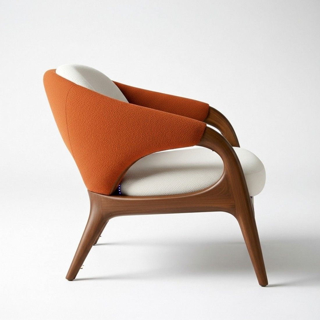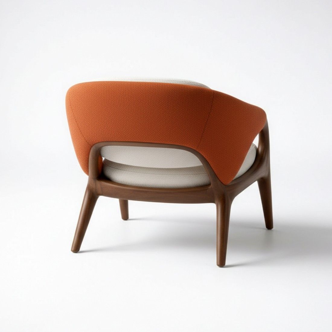 Modern solid wood arm chair with a rich walnut finish and soft beige cotton upholstery. Designed with cushioned seating, curved armrests, and a high back for everyday comfort and style.