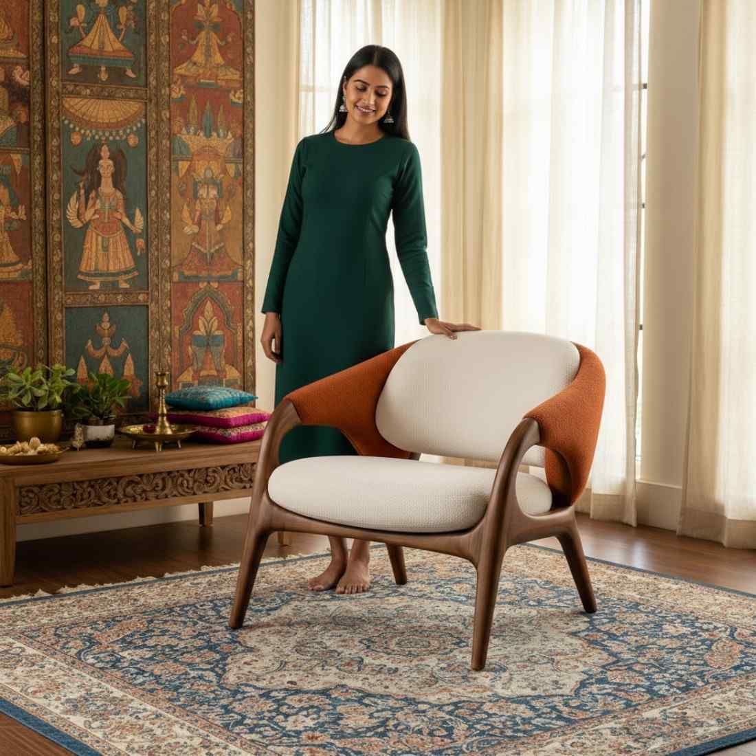 Relax in everyday comfort with this modern solid wood arm chair, crafted to bring warmth and style to your space. The walnut finish frame adds a rich wooden touch, while the beige cotton upholstery keeps the look soft and inviting. With curved armrests, cushioned seating, and a high backrest, this chair is made for long sitting hours without losing its modern charm. A perfect fit for living rooms, reading corners, or stylish office spaces.