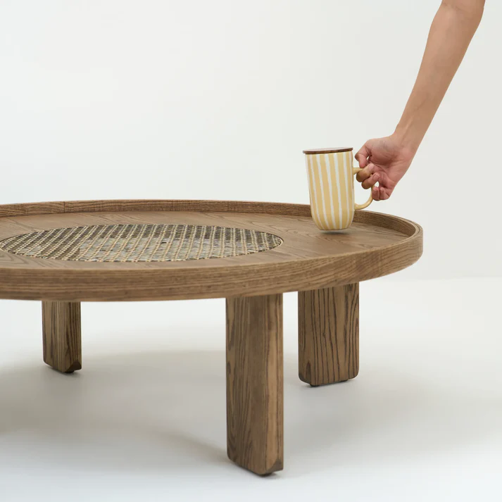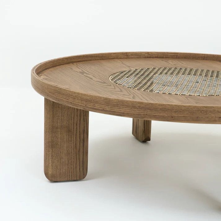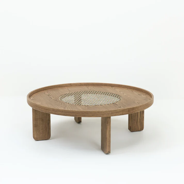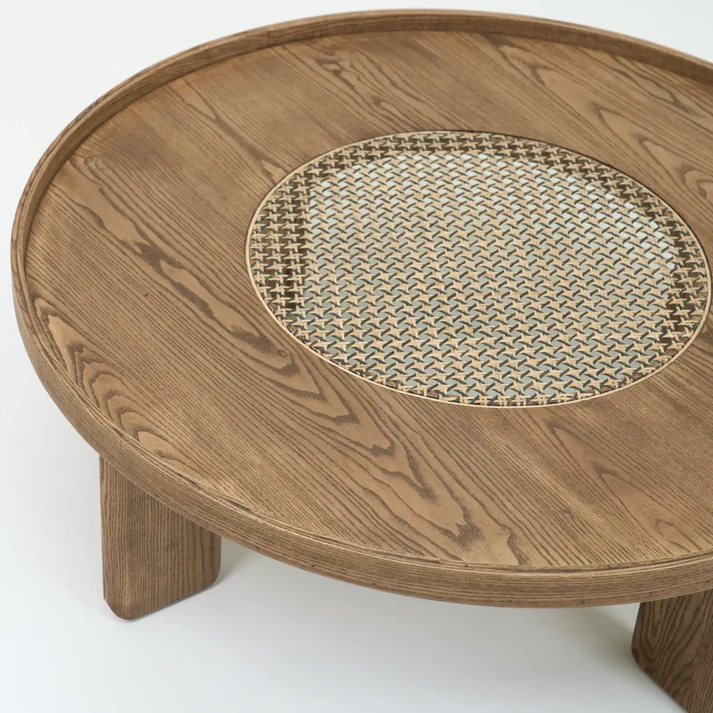 Minimal in form this coffee table is enhanced by a dual toned intricate woven cane detail. A wooden tray detailed top creates a sense of enveloping the woven cane feature within it’s island. Solid wood legs further elevate the aesthetics of this design.